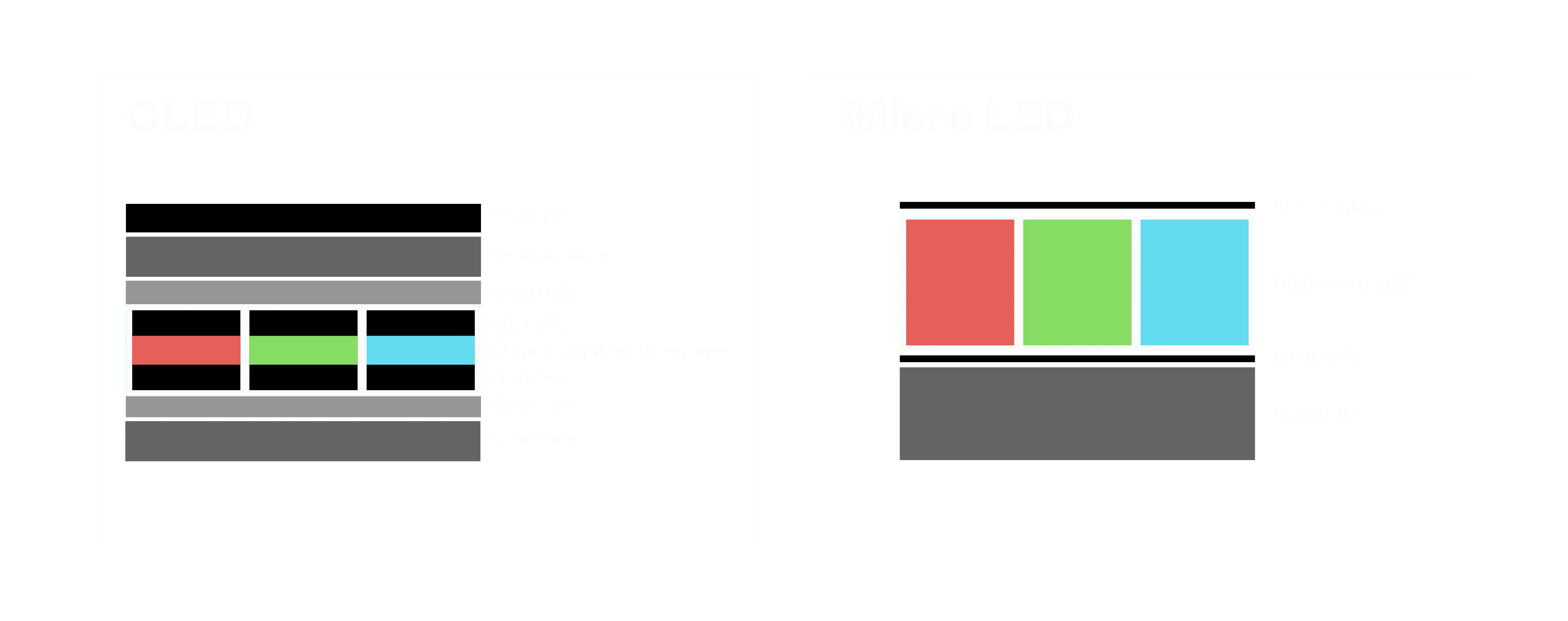 以 LED 做为显示画素,,可让 LED 的发光效率发挥到极致,,,,从而让显示器具备优异的亮度表现,,不论是在户外或室内,,均具备出众的显示效果。。同时,,,与使用有机材料的 OLED 相比,,,LED 具备更稳定、、、、寿命更长的特性,,,,不仅不会有画面烙印问题,,,,而且更不容易出现故障、、、坏点。。。。